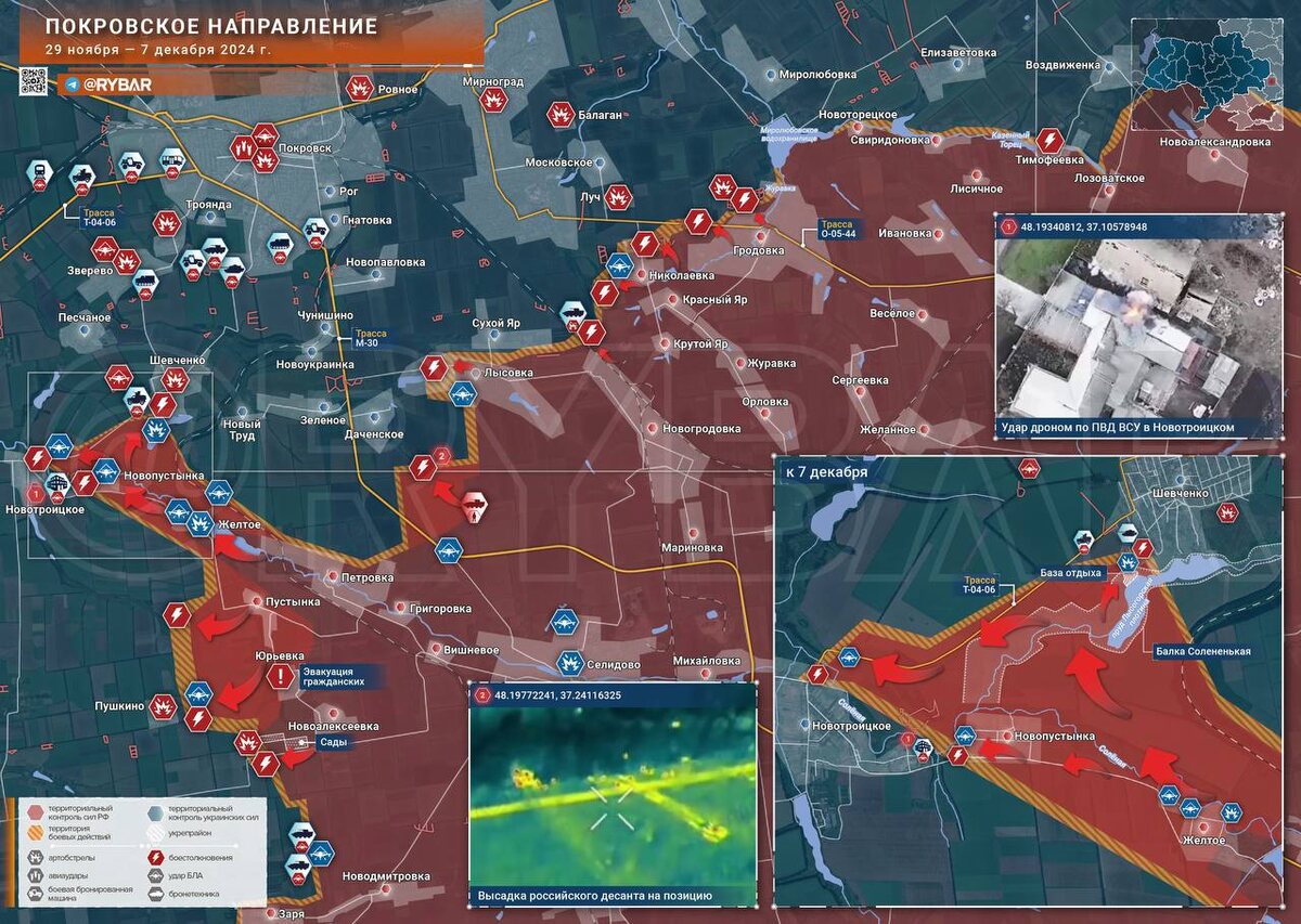 Освобождено Желтое. Это ДНР, Покровское направление. Отличились части группировки войск «Центр». О том, что русская армия постепенно берет в клещи Покровск я уже писал. Кроме того, сегодня пришло известие, взяли элеватор, важный узел обороны ВСУ в Курахово. По некоторым данным, Курахово уже практически все. Из города выведены уже наиболее боеспособные части, остались одни мобилизованные, в качестве смертников, которых не жалко. Также сегодня пришло известие, что наши войска (впервые с 2022 года), вошли на территорию Сумской области. Заняли территорию рядом с селом Александрия. Как предполагается, это связано с задачей отрезать группировку ВСУ, находящуюся в Курской области. Ждем новых хороших новостей! Да здравствует русская армия! Да здравствует русский солдат!
