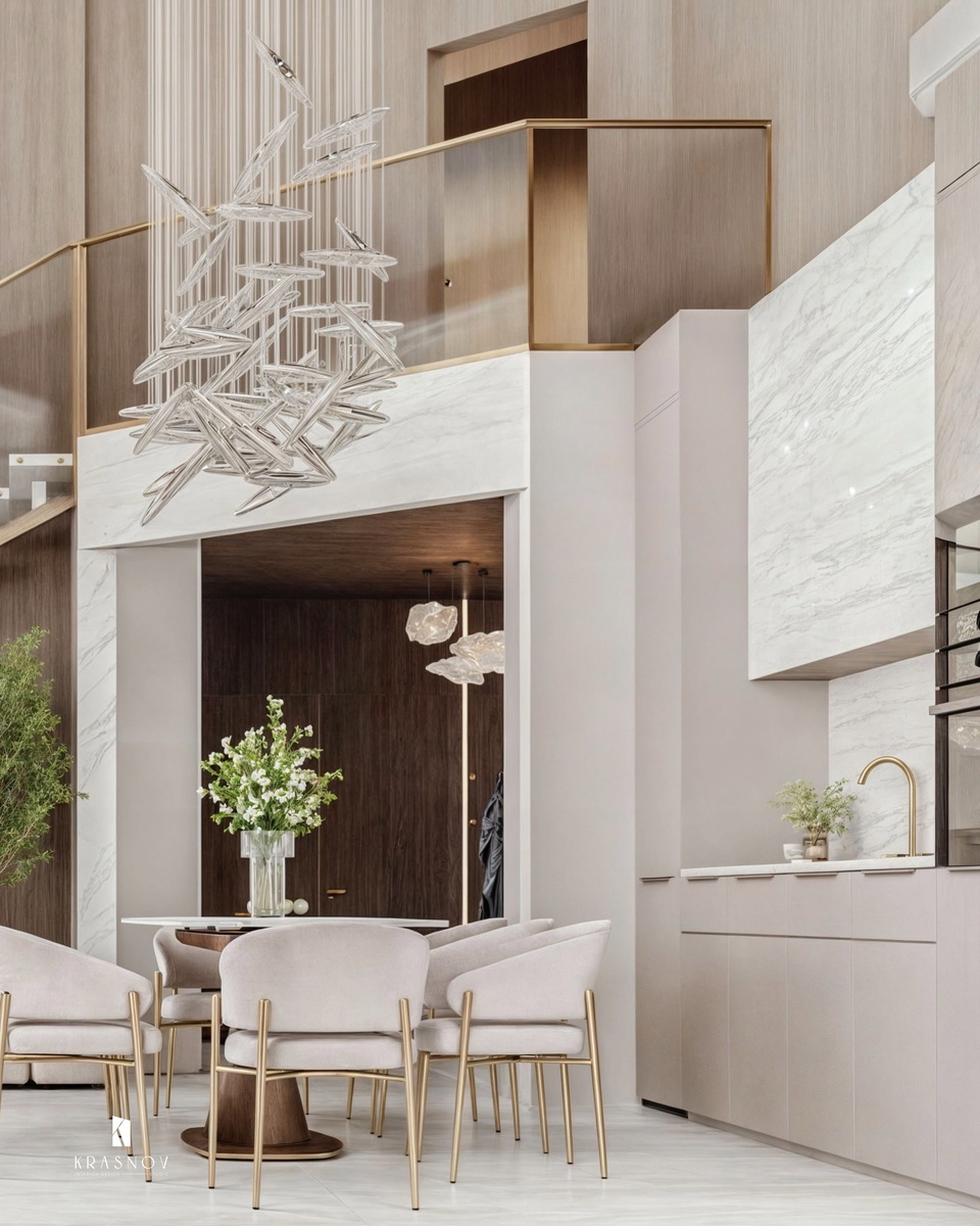 В проекте загородного парк-отеля Дача Винтера сделали просторную кухню-гостиную в бежевых тонах с латунными акцентами. В зоне кухни использовали сочетание минималистичных фасадов с фрезерованными, а также фактуру мрамора. Над большой обеденной зоной разместился эффектный светильник, который напоминает листья дерева. В гостиной расположился большой диван и уютные кресла, а также латунный торшер, нависающий над одним из них. ✔️ Журнальный столик повторяет фактуру отделки стен в помещении и добавляет природных нот. А современный камин создает уют и служит акцентом. На стене сделали встроенную подсветку, которая прочеркивает монументальность помещения, как и большие окна. А как вам такой дизайн коттеджа для парк-отеля? Поделитесь мнением в комментариях 👇 #роскошныйдизайн #дизайнзагородногодома #загородныйдом #интерьеркоттеджа