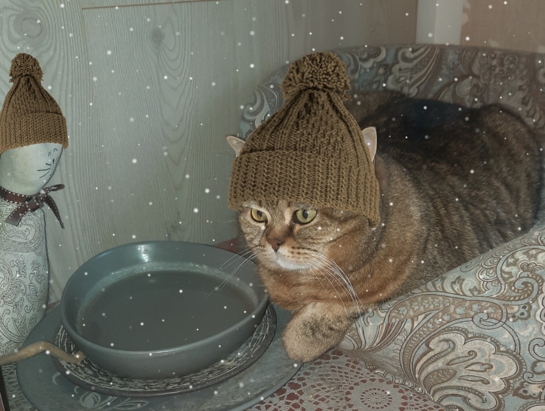 Наверное поэтому на меня шапку напялила на картинке. А, поняла, она ее на Сын Хо до меня натягивала, решила теперь на всех! Ну тогда давай и на другого кота! Все будем в шапках дома ходить. Хорошо хоть не взаправду.