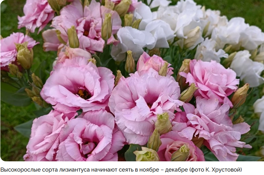 В последнее время у наших садоводов стало популярным очень красивое растение – эустома или лизиантус. Но в его выращивании есть одна сложность – для получения рассады нужно очень много времени. Поэтому к посему семян эустомы приступают зимой – в декабре-январе, а некоторые цветоводы даже в ноябре. Когда посеять эустому зависит ото некоторых факторов: Но следует помнить, посев эустомы зимой обязательно подразумевает использование досвечивания. Для хорошего роста рассаде эустомы нужен световой день не менее 16 часов. Приготовим субстрат и емкости для посева – это могут быть небольшие контейнеры, плошки или горшочки. Грунт должен быть воздушным, питательным и рыхлым. Подойдет смесь любого цветочного грунта с вермикулитом или перлитом. Для посева лучше выбрать гранулированные семена эустомы – их сеять легче. Так как в обычном виде семена очень мелкие, их лучше смешать с прокаленным песком. Выбранные емкости заполняем субстратом, увлажняем и выравниваем. На поверхности располагаем семена –