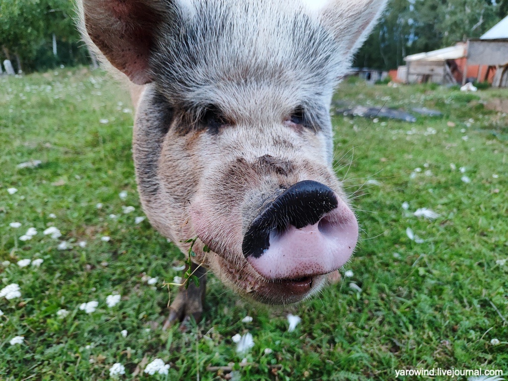 Заглянули мы тут как-то летом на мини-ферму. Ну, как ферму – просто одна женщина имеет довольно большой участок земли и держит на нем разных домашних животных. Наши сердца покорил хряк Карлуша. Вы только посмотрите какие у него реснички!:) Карлуша очень добрый и общительный. Он очень любит, чтобы ему почесали бочок:). Хозяйка его любит и сказала, что под нож пускать не будет. Это этакое домашнее животное:). Поэтому его сильно не раскармливают, чтобы он был в хорошей физической форме. Живет там еще молодая телочка. И стая гусиков. Но Карлуша лучше всех:).