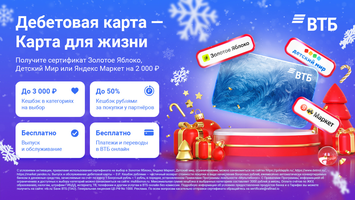 Оформите самую выгодную дебетовую карту от ВТБ и получите сертификат на выбор на 2 000 ₽ в подарок: Золотое яблоко, Яндекс маркет или Детский мир 🔥🔥🔥 В акции может принять участие любой пользователь, у которого за 90 дней до даты старта настоящей акции не было дебетовой карты ВТБ. По условиям акции клиент может подать только одну заявку и получить лишь один сертификат. Клиент может принять только в одной акции на выбор (на лендинге с сертификатом Озон или на мультилендинге с сертификатами Золотое яблоко, Яндекс маркет, Детский мир) 1. Оформите карту по ссылке 2. Совершите любую покупку (Исключения составляют покупки с МСС-кодами, указанными в правилах акции) 3. Сертификат на 2 000 ₽ придёт в смс на указанный номер в течении 60 дней. 🎆До 3 000 ₽ кешбэк в выбранных категориях 🎆 До 50% кешбэк за покупки у партнеров 🎆Бесплатный выпуск и обслуживание 🎆Без комиссии платежи и переводы в ВТБ онлайн 🎆Безопасная и быстрая оплата покупок смартфтоном с помощью сервисов Mir Pay 🎆