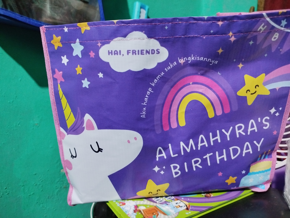 Вчера был день рождения у Альмахиры - она тоже одарила весь класс А-2. Немного скромнее, чем двое предыдущих детей, но тоже хорошо. Помимо торта, который дети съели в классе, Альмахира всем раздала пакеты с единорогом. Внутри было следующее: Пускалка мыльных пузырей - у Амиры была такая, но давно сломалась. Теперь новая вот. Ещё полезные вещи - скетчбук: Раскраски - 7 картинок на отдельных листах: Табличка с именем и маркер, чтобы обводить и писать: Амира сразу опробовала: Вкусняшки: Это уже третий раз, когда дети из класса Амиры возвращаются домой с подарками. Примечательно, что я ещё не видела, чтобы дети из других трëх классов получали подарки на чей-то день рождения, хотя семестр почти закончился.