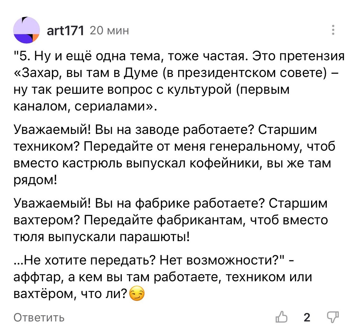 Получил вчера примерно 50 таких писем. Авторам кажется, что они крайне оригинальны и остроумны. Ещё было в комментариях: «А что вы тогда делаете в президентском Совете по культуре?» «А зачем мы вас выбирали в Госдуму?» «А с кого нам спрашивать, ты тогда кто!?» И прочие «почему», «чего», «а хули». Наберусь терпения и отвечу по пунктам. 1. Заменить руководителей главных телеканалов может только глава государства. Даже если Зюганов, Слуцкий, Миронов, Нечаев, Журавлев и 55 единороссов пожалуются на Эрнста – это ни на что не повлияет. Это не в их компетенции. 2. В президентском Совете по культуре наряду со мной на тех же правах работают руководители телеканалов, включая Эрнста. В рамках Совета моё слово весит ровно столько же, сколько их слово. Можно, конечно, со шпагой, как Чацкий, – тыкать во все стороны и кричать звонкие монологи, но наш политикум давно научился помещать таких людей в психушки. 3. Говоря про «вахтера» и «электрика», я пытался объяснить вменяемым людям, что статус депутат