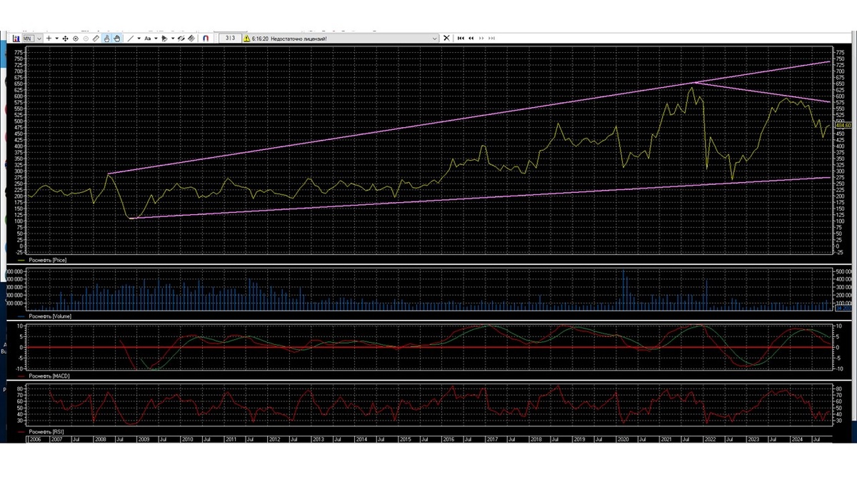 Недельный график показывает, что акция Роснефть находится в растущем расширяющемся тренде 275-750. Внутри тренда идет волновое движение акции Роснефть, на уровне 600 движение наверх было остановлено. Начался процесс понижения до уровня 430, где быки пробуют остановить просадку и развернуть движение наверх.