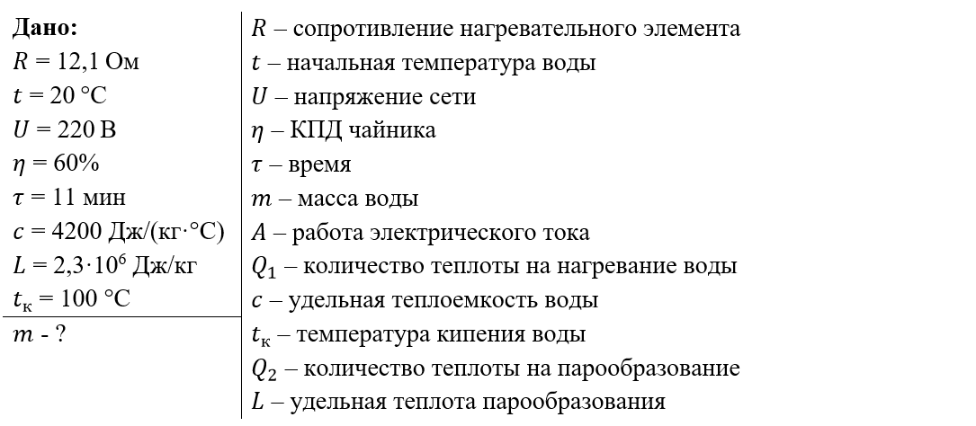 Полное условие задачи: В электрочайнике с сопротивлением нагревательного элемента 12,1 Ом находится некоторая масса воды при 20 °С. Электрочайник включили в сеть с напряжением 220 В и забыли выключить. Какова масса воды, находившейся в чайнике, если при КПД, равном 60%, через 11 мин вода полностью выкипела? Краткое условие задачи: Решение задачи: Работа электрического тока частично идет на нагревание воды и на обращение воды в пар Тогда КПД нагревателя равен Откуда находим массу воды: Ответ: 0,6 кг.