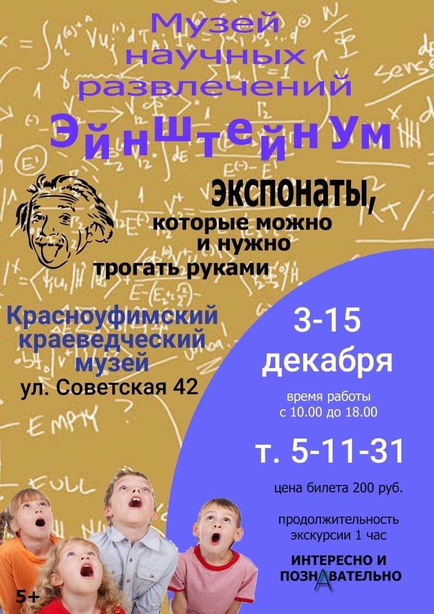 Публикуем программу мероприятий на ближайшие дни. Внимание, она может меняться и дополняться. 3-15 декабря, 10.00-18.00 — музей научных развлечений «Эйнштейнум» (Красноуфимский краеведческий музей, 6+). 11 декабря 18.00 — концерт Павла Баканова (центральная библиотека, 12+); 20.00 — первенство студенческой лиги по волейболу среди команд СПО (ФОЦ «Сокол», 6+). 12 декабря 11.00 — веселые старты «Папа, мама, я — спортивная семья» среди семей с детьми с ОВЗ (ФОЦ «Сокол», 6+); 16.00 — торжественное вручение паспорта «Новое поколение — гордость России» (МЦ «Космос», 6+); 18.00 — концерт Зульфиры и Алмаза Мирзаяновых (ЦКиД, 12+). 13 декабря, 17.00 — концерт живой классической музыки и ярмарка в поддержку Кости Митрофанова (ДШИ, 0+); 18.00 — оперетта «Прекрасная Галатея» (ЦКиД, 12+). 13-14 декабря, 9.00-18.00 — выставка-продажа «Мир камня» (краеведческий музей, 6+). 14 декабря 10.00 — областные соревнования по пауэрлифтингу (троеборью, троеборью классическому; жиму, жиму классическому) среди ю