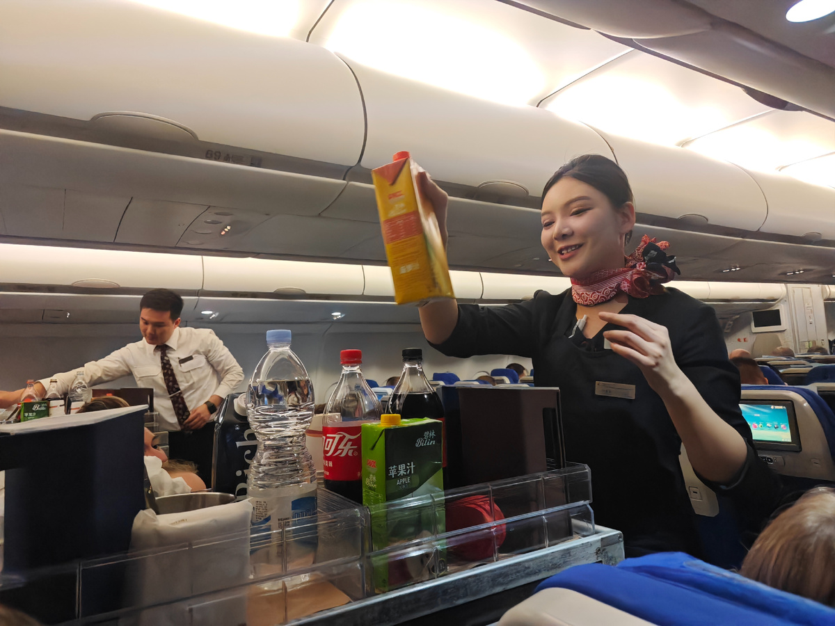 Перелет довольно долгий (9 часов 25 минут удовольствия), а потому был ещё и завтрак. Подавали омлет, десерт, круассан, джем, фруктовый салат (на этот раз абрикосы и ананасы из банки), яблочный сок «Сады Придонья». А также чай/кофе и соки китайского производства (название которых, к слову, «нефритовая роща»).