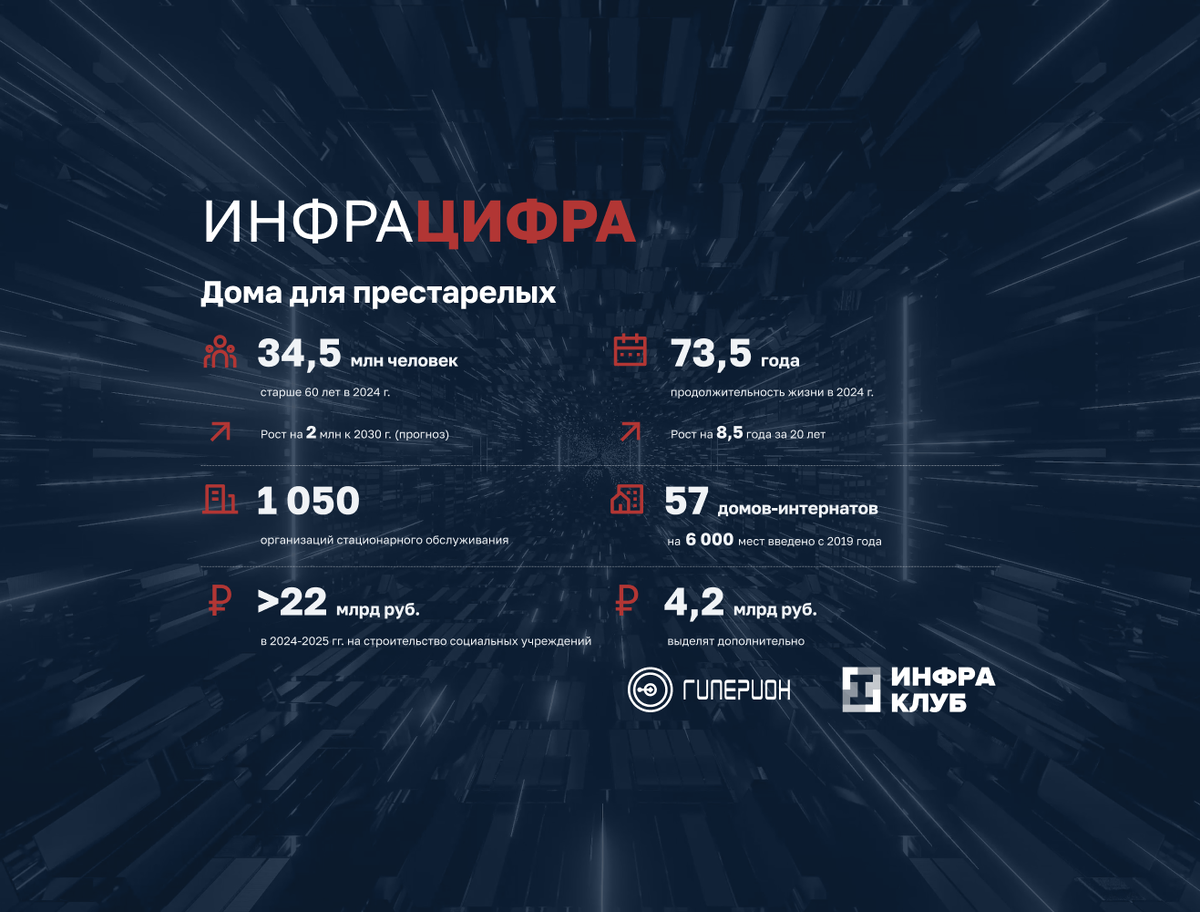 Сегодня в рубрике #ИнфраЦифра поговорим о состоянии учреждений для пожилых людей, о проблемах, их решениях и финансировании отрасли. 👵🏻 На данный момент в России проживают 34,5 млн человек старше 60 лет. По прогнозам, к 2030 году их будет на 2 млн больше. Растёт продолжительность жизни в стране. По оценке Росстата, она составляет 73,5 года. За последние 20 лет продолжительность жизни в России увеличилась на 8,5 года. Число россиян старше трудоспособного возраста около 25%, по демографическому прогнозу Росстата, к 2025 возрастёт до 27% и составит более 40 млн человек. 👩🏼⚕️1050 организаций стационарного обслуживания, по информации Минтруда, действует в России, из них 514 – это дома-интернаты для пожилых людей и 536 психоневрологических интернатов для людей с ограниченными возможностями. В 2024 году в них проживет около 300 000 человек. 57 домов-интернатов для проживания 6 000 человек было введено с 2019 года. По нацпроекту «Демография» в ближайшие 2 года планируется построить ещё 26