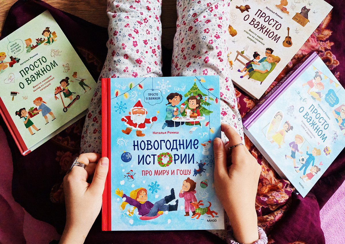В издательстве МИФ вышла очередная книга Натальи Ремиш серии «Просто о важном. Про Миру и Гошу» — «Новогодние истории про Миру и Гошу». Это уже шестая книга серии. У нас в домашней библиотеке есть только три первые издания этой серии. Самое первое издание про Миру и Гошу для меня было неоднозначно – вопросов больше, чем ответов. Вторая книга отозвалась больше, а третья оказалась очень полезная. Возможно, так совпал возраст моего ребенка и героев, что темы книги были актуальны в момент чтения. И пара книг «прошла мимо» нас, о их существовании я только узнала. Сейчас прочитали «Новогодние истории про Миру и Гошу». На самом деле, в семье уже три ребенка: старший Гоша, средняя Мира, они школьники и младшая двухлетка, которую все называют Бейби. Ситуации, которые с ними случаются, самые обычные — не поделили конфеты, не стали играть с младшей и прогнали ее, потерялась любимую игрушку, пошли кататься на горку… В книге 17 глав-историй. В каждой главе рассматриваются какие-то ситуации, и по ок