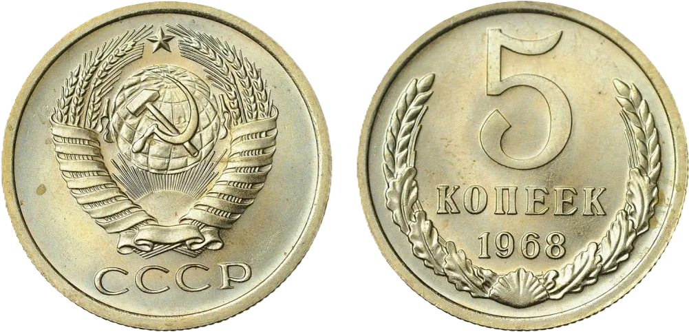 - На реверсе находится номинал "5 копеек" с дата "1968".