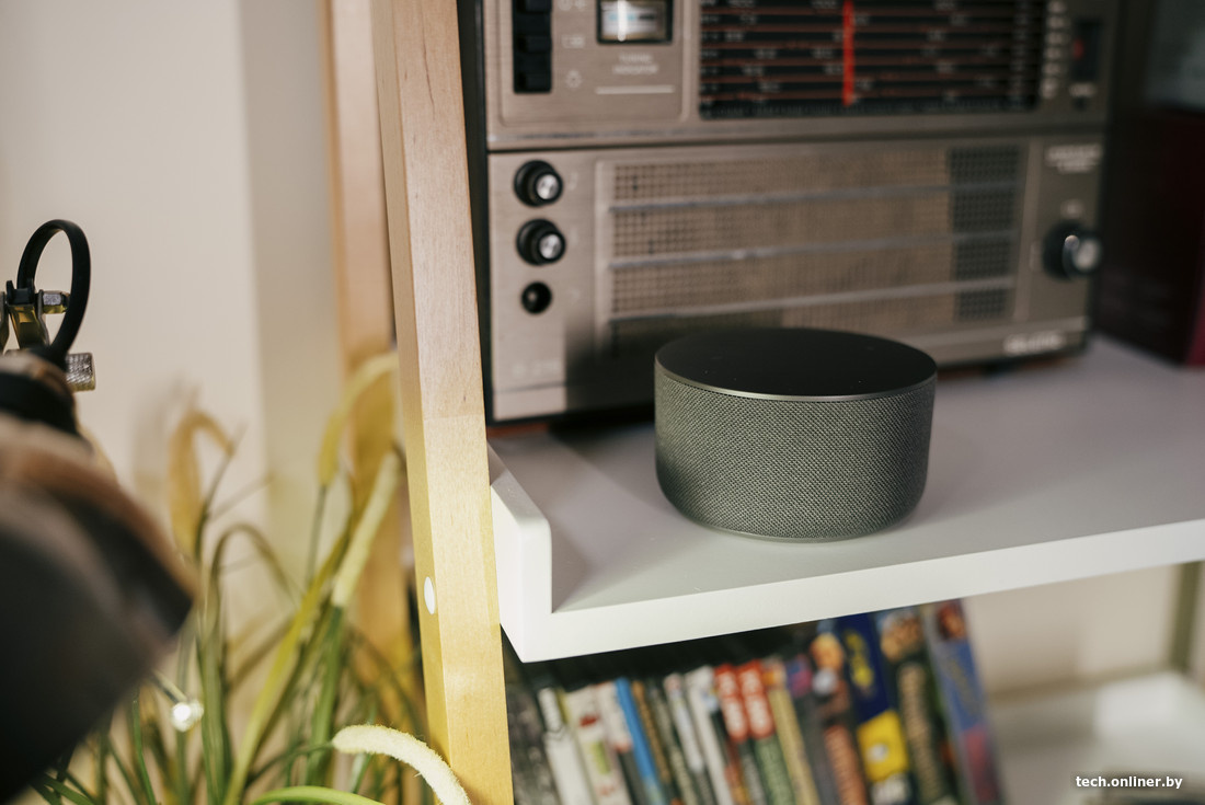 Колонку выпускают в трех цветах: серый, классический черный и более яркий, но тоже приглушенный сиреневый. На смену «шайбе» пришли мягкие и плавные формы. Сверху расположена панель с индикатором и сенсорными кнопками настройки громкости, а также три микрофона и датчик освещенности для авторегулировки яркости экрана.