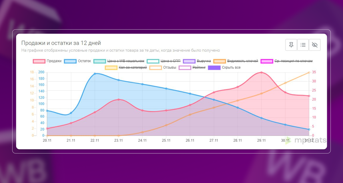 Клиент обратился к нам с запросом вывести его товар в топ и запустить продажи. На старте не было ни карточки товара, ни даже кабинета селлера на WB. При этом товар был из очень конкурентной ниши — женское платье big size. Также задача усложнялась предновогодним сезоном, загрузкой складов и большой конкуренцией. Мы тщательно проработали стратегию вывода товара в ТОП, подготовили карточку и начали работу по продвижению. Уже через 2 дня товар оказался на 37 месте в выдаче по основному ключевому запросу. На 4-й день — вышел в ТОП 10. Количество заказов за эти два дня выросло вдвое, еще через неделю — снова вдвое. А на 12-й день были распроданы почти все остатки. Итог за 12 дней: 241 заказ, 925 413 ₽ выручки, ДРР<3%. И всё это с нуля, с абсолютно новой карточкой и в условиях сильнейшей конкуренции в нише перед Новым годом. Хотите получить такой же результат? Запишитесь на бесплатную консультацию, где мы проанализируем вашу карточку товара, дадим рекомендации и расскажем, как вывести ее в ТО