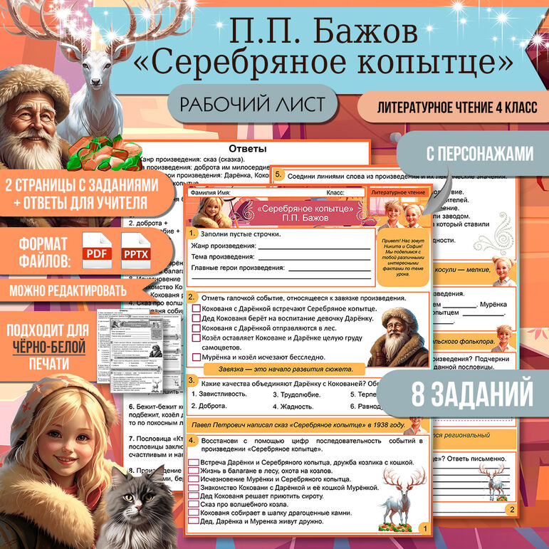Данный рабочий лист создан по теме сказа П.П. Бажова «Серебряное копытце». Материал включает 3 страницы: 2 страницы занимают 8 интересных, разноплановых заданий, 3 страница отведена под ответы для учителя. Рабочий лист представлен в двух форматах: PDF и PPTX (можно редактировать). Уникальность рабочего листа заключается в присутствии персонажей: четвероклассников Никиты и Софии, они поделятся с ребятами различными интересными фактами по теме урока. Содержание заданий: Рефлексия. Рабочий лист по сказке «Серебряное копытце» поможет закрепить и подтвердить знания учеников по произведению. Данный рабочий лист можно использовать непосредственно во время изучения темы, для самостоятельной работы учащихся, а также в качестве домашнего задания. ------------------------------------------------ Вам может быть интересно (дополнительный материал по теме): #литературноечтение #4класс #кроссворд #литературноечтение4класс #образование #школароссии #начальнаяшкола #начальныеклассы #кроссворд
