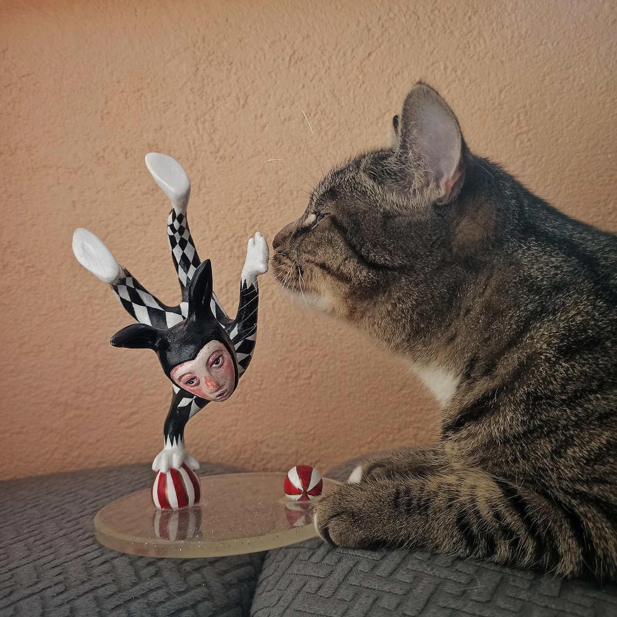 Пока я готовлюсь к новому году и собираю материал для новой статьи, напишу и расскажу, как я лепила вот такую фигурку циркового акробата. Акробат, если что слева. Справа мой кот Кузя - приятно познакомиться! Тут я выкладывала видео обзор на эту фигурку. Для лепки использовала глину la doll (в голубой упаковке), про нее я уже писала в посте про куклу. Пожалуй, это моя любимая глина. Для основания фигурки я использовала проволоку и фольгу: это делается для прочности и, чтобы уменьшить расход глины. Сначала придала фигурке изгиб, а потом начала уже наращивать объемы фольгой. Как обычно в такие моменты нужно четко следить за пропорциями. Сложной задачей было правильно распределить вес на одной руке, идея была в этом. Изначально я хотела сделать такую статуэтку без подставки, просто акробат на одной руке. Но на практике добиться этого было очень сложно, скорее всего и-за веса. Такую фигурку нужно было делать из настоящей глины, чтобы она была тяжелая и устойчивая (или делать утяжелитель в