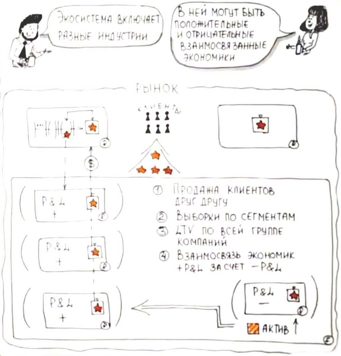 Крупные бизнесы строят экосистемы. Менее масштабные стараются встроиться в другие экосистемы. Почему это так всем нужно? Потому что экосистемы дают возможность зарабатывать кратно больше, охватывая весь пользовательский, клиентский опыт, всю жизнь клиента. С точки зрения продуктового подхода, когда вы строите экосистему, вы исходите не из того, что захватываете всю цепочку создания ценностей, а из того, что у вас есть клиент и вокруг него разнообразные ценности. Например, «я хочу смотреть телевизор», «хочу покупать товары в магазине», «хочу доставку», «хочу читать книги», «хочу обучаться», «хочу здоровье поправлять» и т.д. Это большое количество бизнесов, которые, по сути, пытаются «облепить» клиента со всех сторон. Это некоторый кросс-функциональный бизнес, который обволакивает клиента. На чем зарабатывают экосистемы? На данных о клиенте! Экосистемы имеют капитализацию данных. Это цифровой след, собирание данных. Да, это умные рекомендательные системы, умные системы логистики. Но глав
