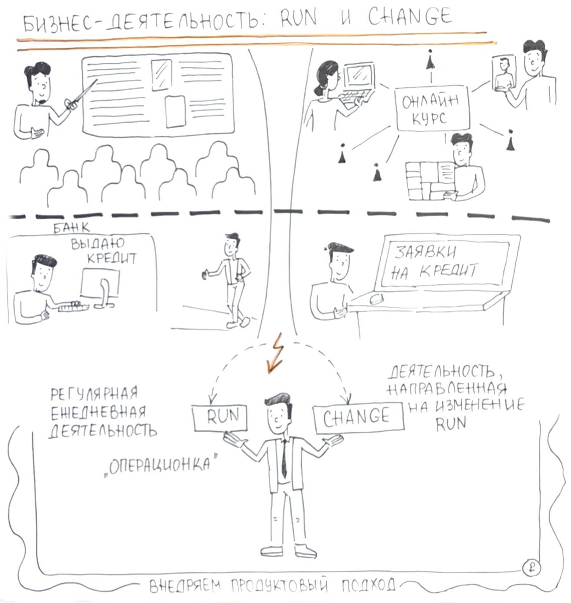 Когда крупный бизнес внедряет продуктовый подход, в нем возникает конфликт двух видов деятельности – RUN и CHANGE. Разберемся с этим подробнее. Например, чтение педагогом лекции – регулярная деятельность. Продакт, который переводит обучение в цифру, чтобы дать обучение миллиону человек, занимается CHANGE. Его задача - убрать педагога из дальнейших выступлений. Они антагонисты, противодействуют друг другу. Один работает, а второй пытается его изменить. Пример банка. Он выдает кредит. Приходит цифровизатор-трансформатор и предлагает всю выдачу кредитов перевести в онлайн – больше народу сможем обслужить, говорит он, но возникает конфликт. Этот конфликт на рынке называется конфликт RUN и CHANGE. То есть конфликт операционной деятельности и деятельности, направленной на изменения. В крупном бизнесе часто один человек может быть в позиции и RUN, и CHANGE. Например, директор страховой компании, с одной стороны, должен не завалить страховой бизнес со всеми выдачами ОСАГО, КАСКО и т.д., еще и