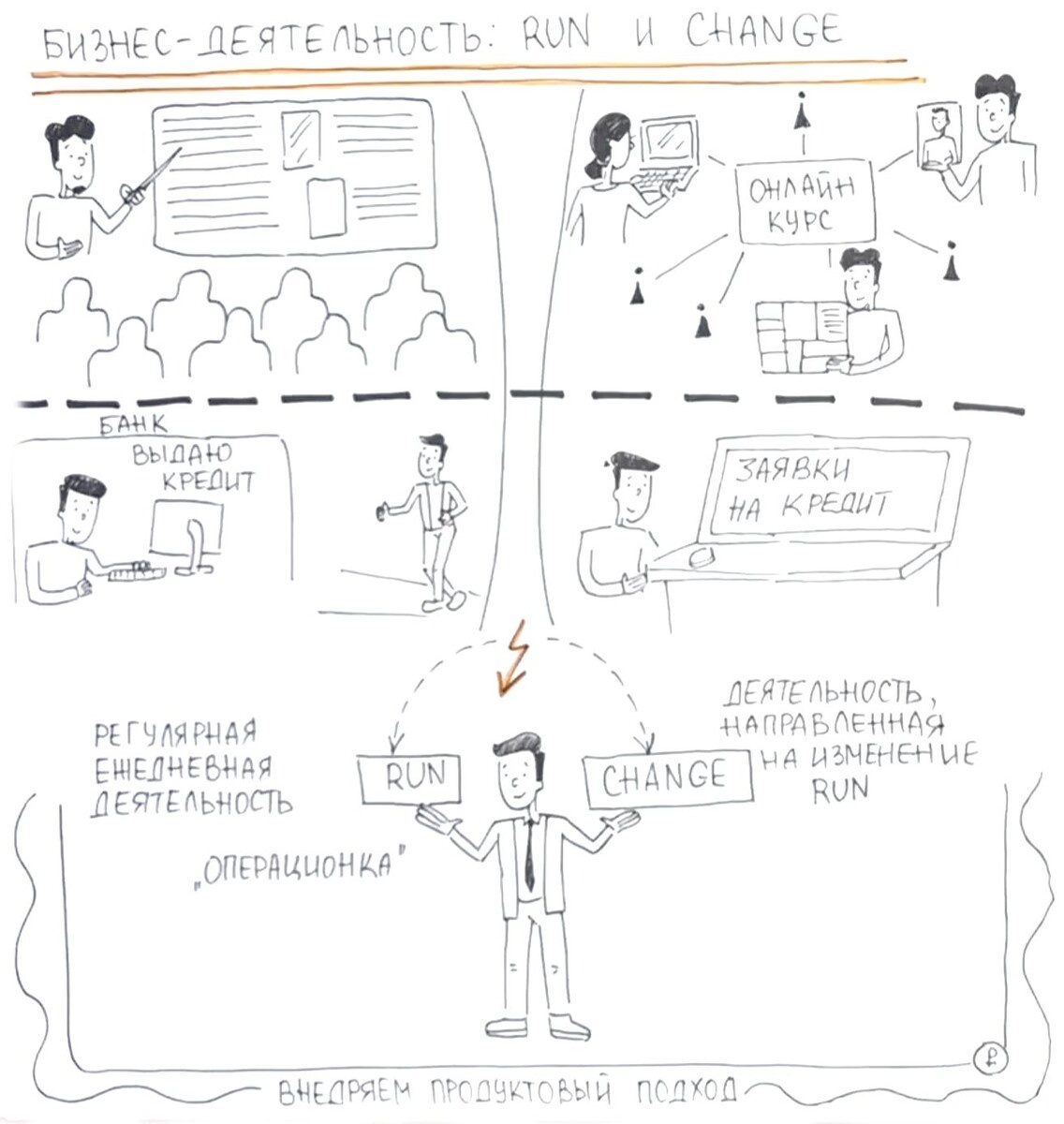 Когда крупный бизнес внедряет продуктовый подход, в нем возникает конфликт двух видов деятельности – RUN и CHANGE. Разберемся с этим подробнее.