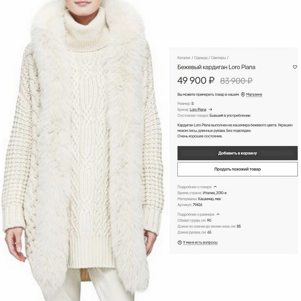 В общем, сижу, примус починяю никого не трогаю — раздумываю о том, чем бы вас ещё порадовать... и тут попадается мне реклама кардигана от Loro Piana. Высокими ценами от люксовых брендов меня уже не удивить, но глаз зацепился за приписку «бывший в употреблении».