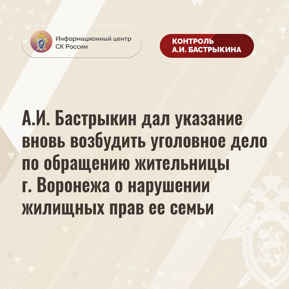 А.И. Бастрыкин дал указание вновь возбудить уголовное дело по обращению жительницы г. Воронежа о нарушении жилищных прав ее семьи