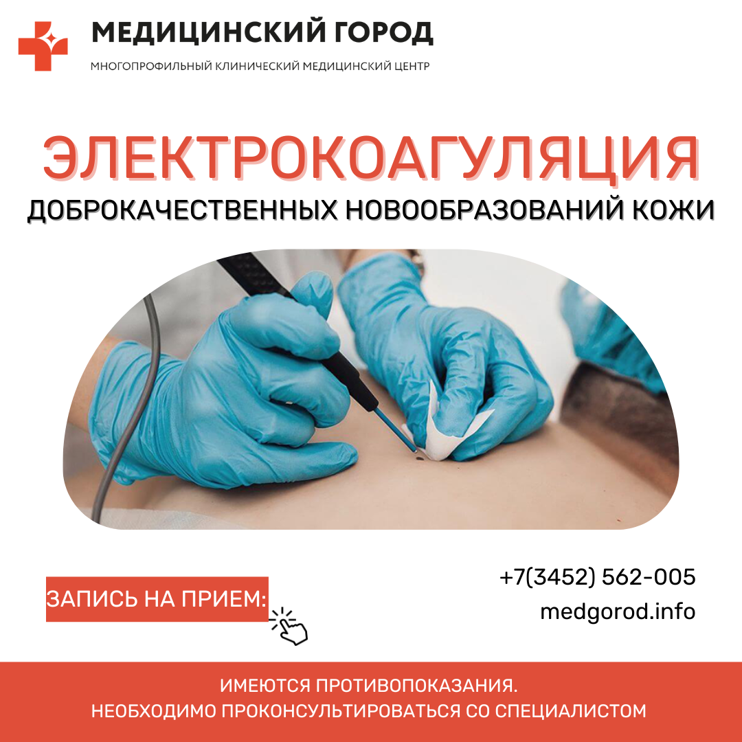 К основным преимуществам электрокоагуляционного метода удаления новообразований можно отнести: Перед процедурой необходимо проконсультироваться с профильным специалистом – врачом-онкологом. Врач проведет осмотр, определит тип новообразования и оценит возможность электрокоагуляционного иссечения. Не все новообразования можно удалять электрокоагуляцией, и процедура имеет ряд противопоказаний. К ним можно отнести: В МКМЦ «Медицинский город» иссечение доброкачественных новообразований кожи методом электрокоагуляции проводится высококвалифицированными специалистами в рамках дневного стационара по хирургии на самом современном и эффективном оборудовании. Удаление новообразований проводится не только в терапевтических, но и в косметологических целях. Осень и зима – наиболее подходящие сезоны для удаления новообразований кожи, т.к. после процедуры не рекомендуется подвергать место иссечения воздействию ультрафиолетового излучения. Более подробно об услугах , предоставляемых ГАУЗ ТО "МКМЦ "Мед