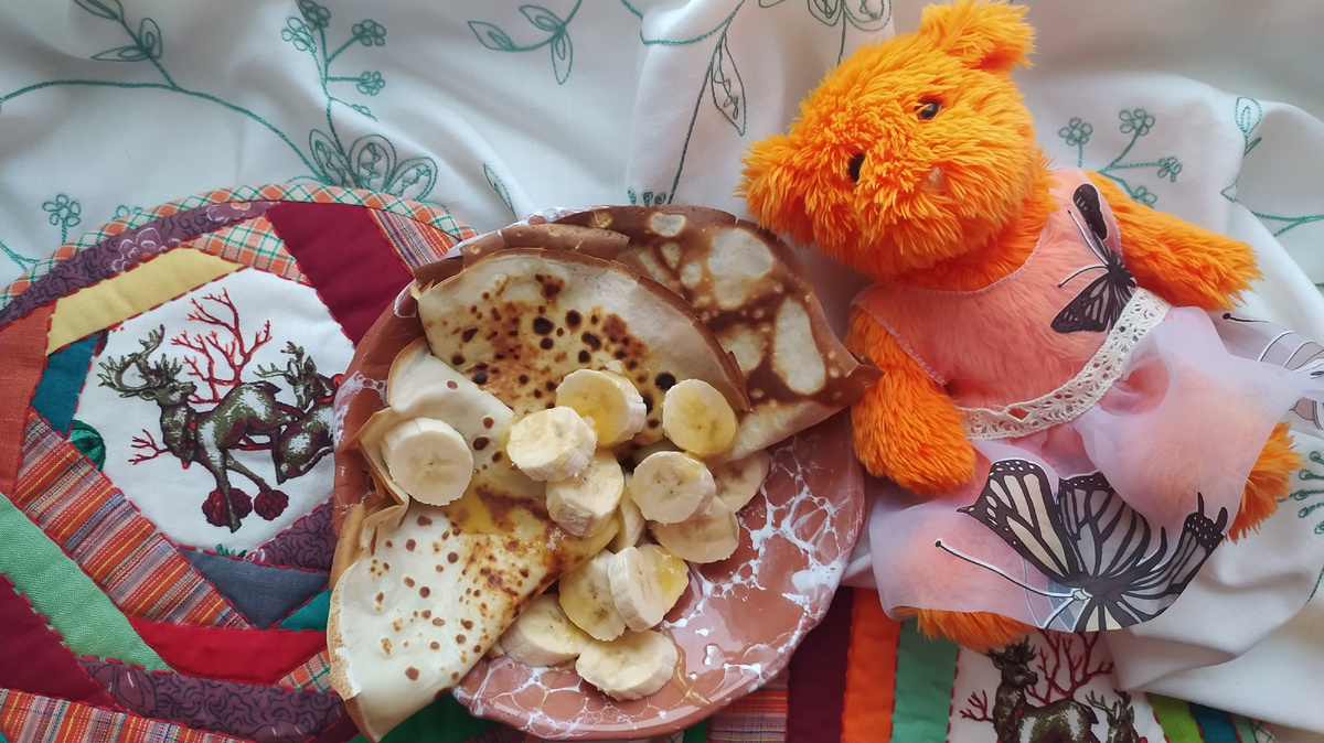Оранжевая Света с оранжевым медведем оранжевые блинчики оранжево печëт... Утро началось очень бодро, этот выходной должен стать ударным днëм. Я даже успела принять душ... Но далее всяческая вода иссякла. Добро пожаловать в гости. Если заглянули в «Кармашек» впервые - будьте готовы к уютному, доброму общению. Рукоделие, фотопутешествия, фотопоэзия и поиск счастья в ежедневности - это нас объединяет, дарит силы и вдохновение. Канал дневниковый, всë субъективно и от первого лица - пережитое и увиденное лично. За окном ещё темно, -3°С. Но грустить смысла нет, а список дел есть. Водяное перемирие, оно же Великая Сушь отменило стирки и прочие мокрые дела - значит, быть обжорству! Напекли мы с Морошкой блинов. Себе, конечно, сделала партию сильно подгорелых. Чтобы не смущать неокрепшие впечатлительные умы зрителей, которые в прошлый раз испугались, положила на тарелку лучшие из худших. Плюс банан и мëд. Ням! Потом что-то гладила, что-то с места на место перекладывала, создавала видимос