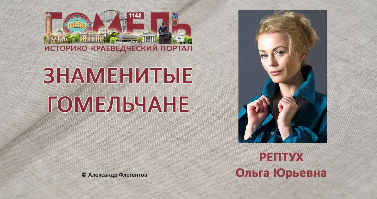 Ольга Юрьевна Рептух (01.10.1978, Гомель) — актриса театра и кино. В детстве серьёзно занималась спортивной гимнастикой, но в старших классах увлеклась художественной самодеятельностью. После окончания школы поступила в Школу-студию при местном драматическом театре, и сразу была зачислена во вспомогательный состав труппы. Получив диплом, она отправилась продолжать образование в Минск, окончила Государственную академию искусств. С октября 2006 года по январь 2007-го Ольга Рептух работала в театре «Пилигрим» в городе Сидней (Австралия). В этот период Ольга успела приступить к репетициям мюзикла (в переводе на русский – «Восемь женщин на шее»). Но получив более интересное предложение из Беларуси (сняться в главной роли в картине «Чаклун и Румба»), отказалась от участия в музыкальном проекте, а по приезду в Минск – и от идеи вернуться в Сидней. До Австралии и после активно снималась в кино, где впервые появилась на экране в 2004 году в фильме «Вам – задание». 2024 — Тайны следст