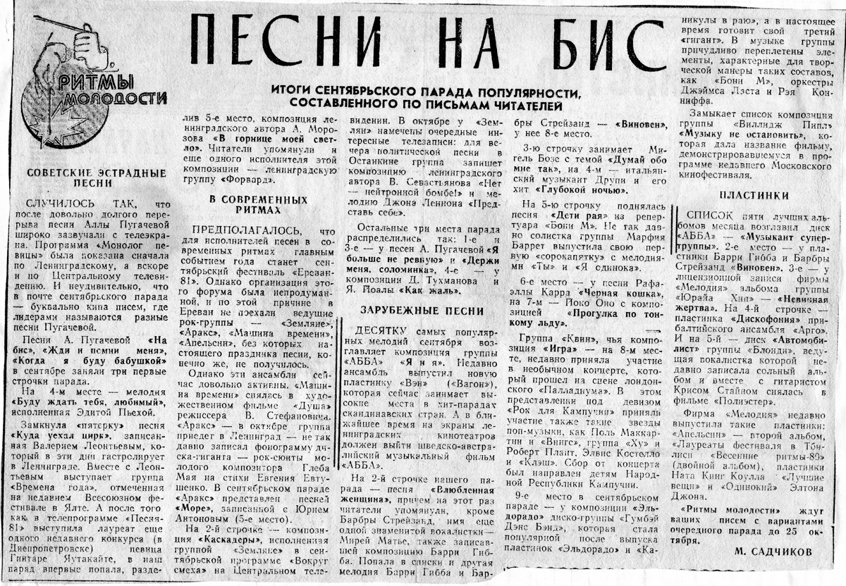 Парад популярности газеты "Смена" (Ленинград) сентябрь 1981г