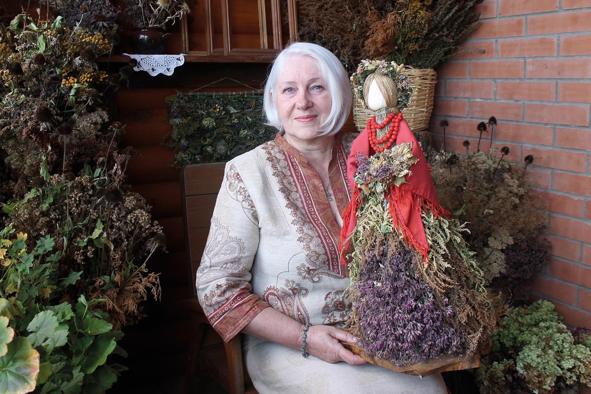 Попадая в гости к Елене, будто переносишься в добрую сказку, где уютно, ароматно и каждый сантиметр пространства заставляет замирать от удивления. То аккуратно собранные веники шалфея под самым потолком приковывают взгляд, то букетик душицы на стене привлекает внимание своими сиреневыми оттенками. А уж куклы в доме хозяйки и вовсе повсюду: они деловито устроились на подоконниках и на ступенях, свисают с потолка и встречают гостей на каждом шагу с настенных панно. По пути на второй этаж дома ждет влюбленная пара: на девушке – пышная юбка, а на статном кавалере рядом – рубаха. И наряды эти – из листьев мать-и-мачехи.
