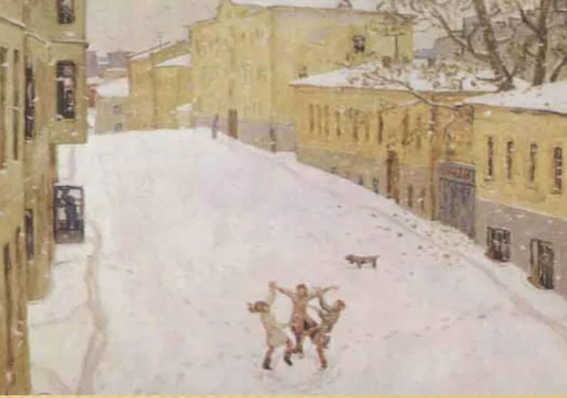 На картине Игоря Попова «Первый снег» перед нами открывается уютная городская улочка, окутанная мягким покровом свежевыпавшего снега. На переднем плане радуются три девочки, пришедшие на улицу, чтобы насладиться первым снегопадом, что передает ощущение светлой радости и непосредственности. Они веселятся, стремительно поднимая руки к небу, словно пытаясь поймать нежные снежинки, которые, рассыпаясь, танцуют в воздухе. Эта жизнерадостная сцена наполняет картину безмятежной атмосферой зимнего утра.