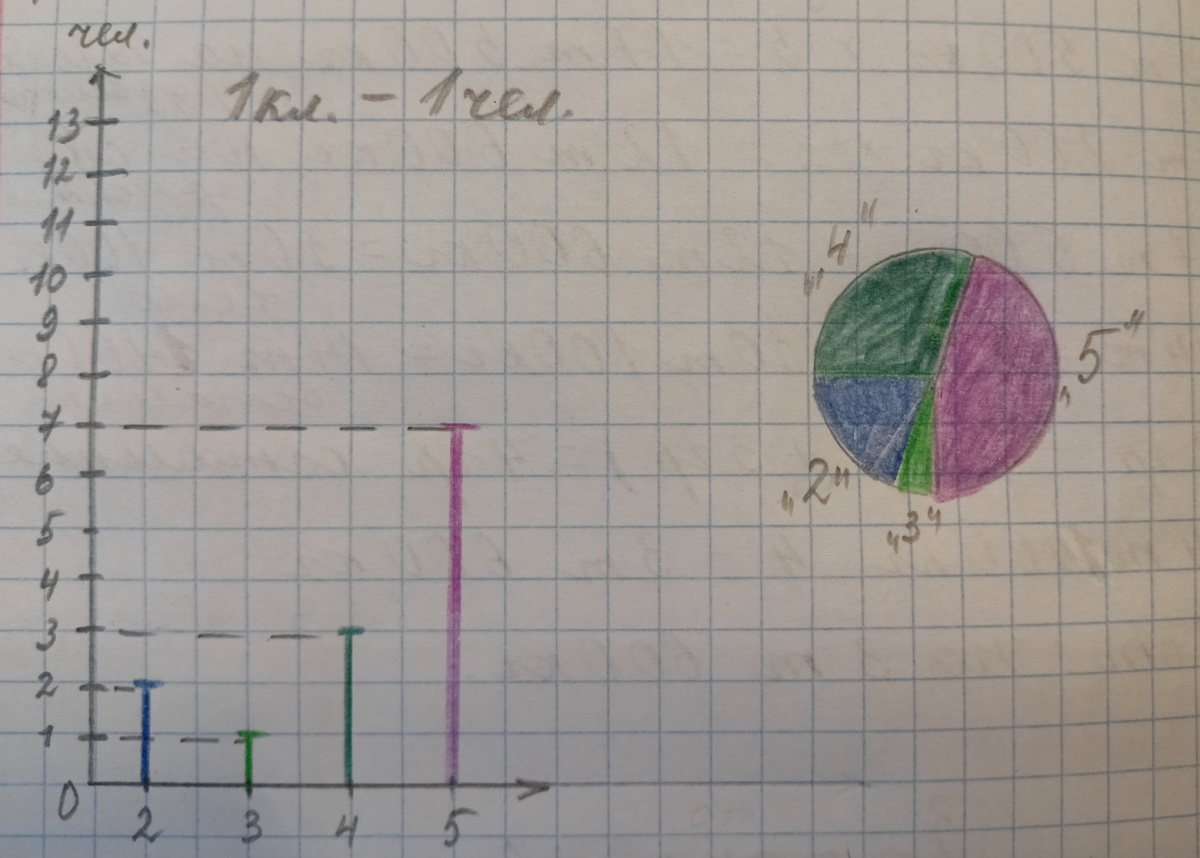 1. Анализ контрольной работы. Учащиеся , которые не справились с работой, получают на дом задание прорешать другой вариант. 2. Объявление новой темы. На доске начерчены диаграммы, изображающие результаты контрольной работы. - Что можно сказать по этим чертежам? (Сколько человек и какие отметки получили). Сегодня мы будем учиться строить такие диаграммы. 3. Работа по теме урока. Откройте учебник на стр. 89. Прочитайте определение диаграммы. - Что такое диаграмма? - Как на диаграмме изображаются числа? - Что нужно сделать прежде, чем чертить диаграмму? - Где используют диаграммы? Диаграмма бывают линейными, круговыми и столбчатыми. N 522. Это столбчатая диаграмма. Диаграмма говорит о том, что самолёт Ил-62 летает дальше самолёта Ту-204. N 523(1). Это линейная диаграмма. Диаграмма говорит, что река Нил самая длинная, а река Рейн самая короткая. N 523(2). Это столбчатая горизонтальная диаграмма. Диаграмма говорит, что вес страуса больше на 63 кг. Таким образом, мы видим, как наглядно ди
