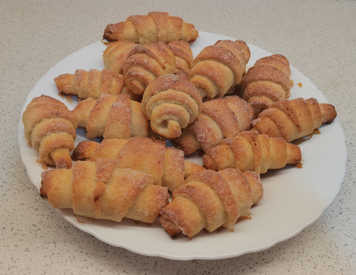 Раскатываем все тесто. Посыпаем сахаром с кокосовой стружкой. Разрезаем на 16 треугольников. Сворачиваем в рогалики. Обваливаем в сахаре. Выпекаем при температуре 180 градусов 25мин., до золотистого цвета. (Кокос можно заменить корицей)