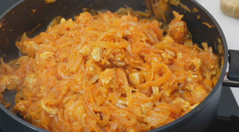 Лавровый лист - 1-2шт СПОСОБ ПРИГОТОВЛЕНИЯ Сначала все подготовим. Берем острый нож и нашинкуем соломкой капусту 1 кг. Теперь порежем луковицу кубиками и куриную грудку 500 грамм. Берем глубокую сковороду у меня диаметром 28 см. Наливаем немного масла, кладем лук и обжариваем до полупрозрачности, теперь добавим куриную грудку и обжарим пару минут, добавим половину ч. л соли и черный перец, теперь добавляем капусту, вливаем 150 мл воды, закрываем крышкой Тушим