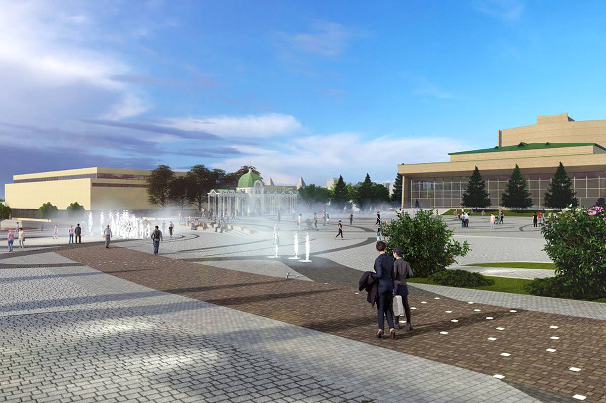 На Театральной площади обновят покрытие из плитки, установят скамейки, осветительные системы и навигационные столбы. Планируется также отремонтировать лестницы и озеленить прилегающую территорию. На театральной площади будут сухие фонтаны и малые архитектурные формы — композиции с лошадями и элементами воды.