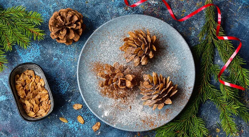 Опытные хозяйки, взглянув на состав ингредиентов, сразу узнают в нем рецепт знаменитого советского пирожного «Картошка». И действительно, готовится новогодний десерт таким же образом — но в другой форме. Печенье измельчаем в блендере или раскатываем скалкой. В молоко добавляем какао-порошок и ставим кастрюлю на медленный огонь. Выкладываем в молоко сливочное масло и даем ему раствориться. Кипятить не нужно! Засыпаем измельченное печенье в шоколадно-молочную массу, замешиваем тесто. Если оно получается жидким, добавьте еще порцию раскрошенного печенья. Из теста лепим пирамидки по форме шишек. Ставим заготовки в холодильник примерно на 1 час. Спустя время можно приступить к украшению десерта. В качестве «чешуек» подойдут шоколадные кукурузные хлопья или шоколадные каллеты (шоколад в форме капель можно купить в супермаркете или заказать на маркетплейсах). Также подойдут и лепестки миндаля. Можно их чередовать — например, сделать часть новогодних шишек с каллетами, а другую час