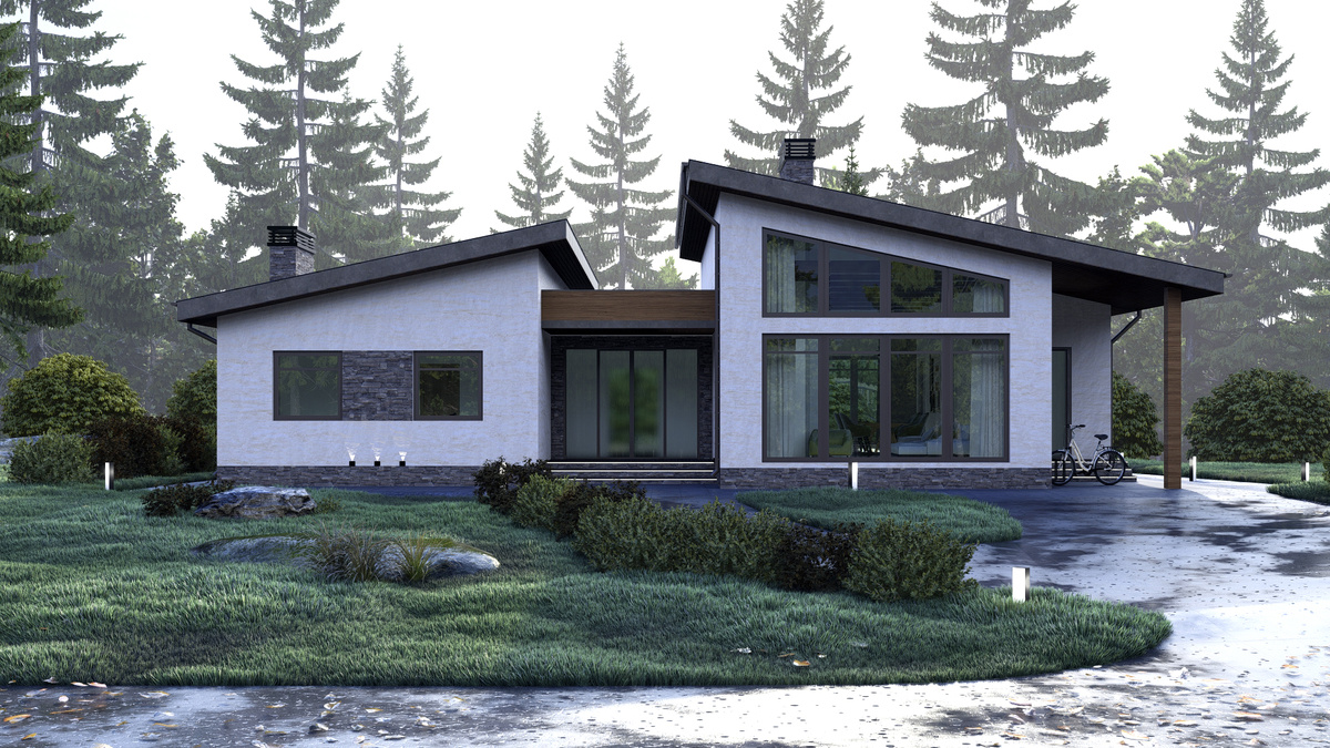 Проект представляет собой уютный одноэтажный коттедж в современном стиле. Необычным решением было применение разноуровневой односкатной крыши, это добавило внешнему виду дома динамичность и сделало общую форму более выразительной. Фасад отделан светлой штукатуркой со вставками из натурального камня.