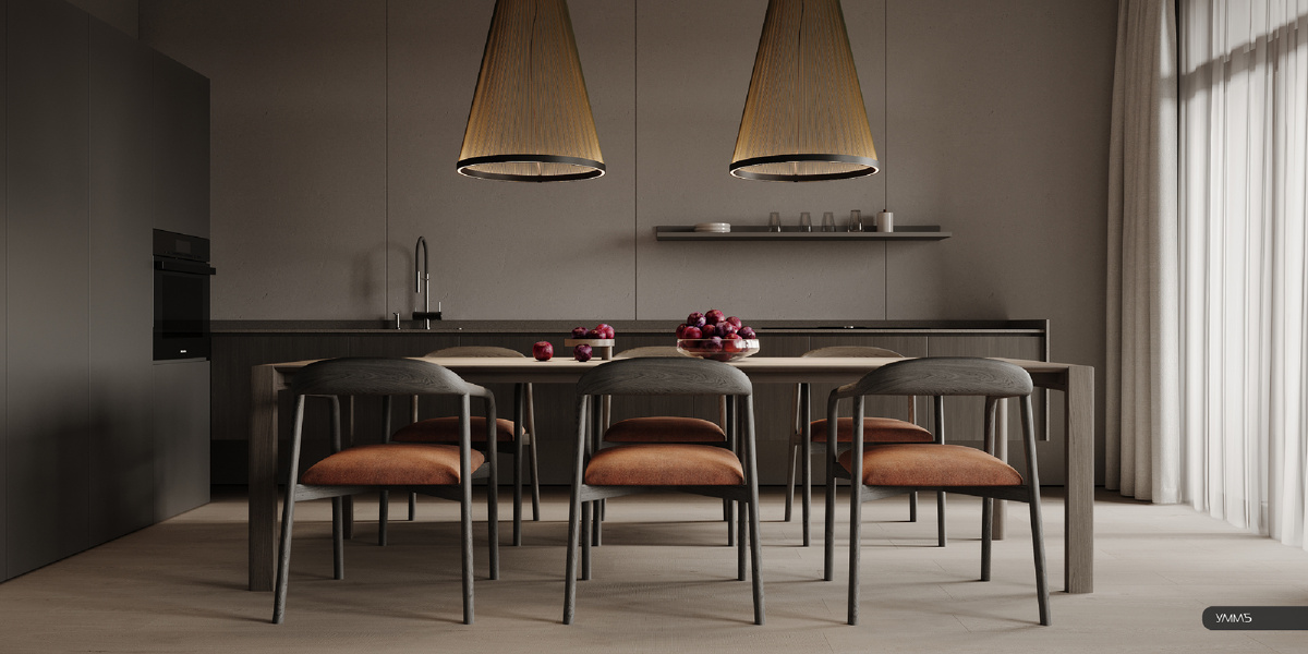 Продолжаем рассказывать о дизайн-проекте квартиры, расположенной в ЖК КутузовGRAD II в г. Москва Кухня В центре кухни установлен большой длинный стол для приема гостей, а над ним подвешены два конусовидных светильника. Благодаря удачной планировке, специалистам студии удалось спроектировать эксклюзивную дизайнерскую кухонную зону в виде подвесной консоли нестандартной высоты с каменной столешницей. Стена над ней оформлена штукатуркой под бетон с разделительными профилями и имитирует массивные бетонные панели, на которых держится столешница. Здесь же установлена открытая полка для завершения общей композиции, с помощью которой выполняется дополнительная подсветка рабочей зоны. У раковины для удобства спроектирован смеситель с дозатором жидкости для посуды, питьевым краником и измельчителем. Так как кухня не имеет верхних шкафчиков, встроенная вытяжка находится в варочной плите. Слева от зоны готовки в матовых пеналах скрыта вся бытовая техника в том числе сушильная и стиральная маши
