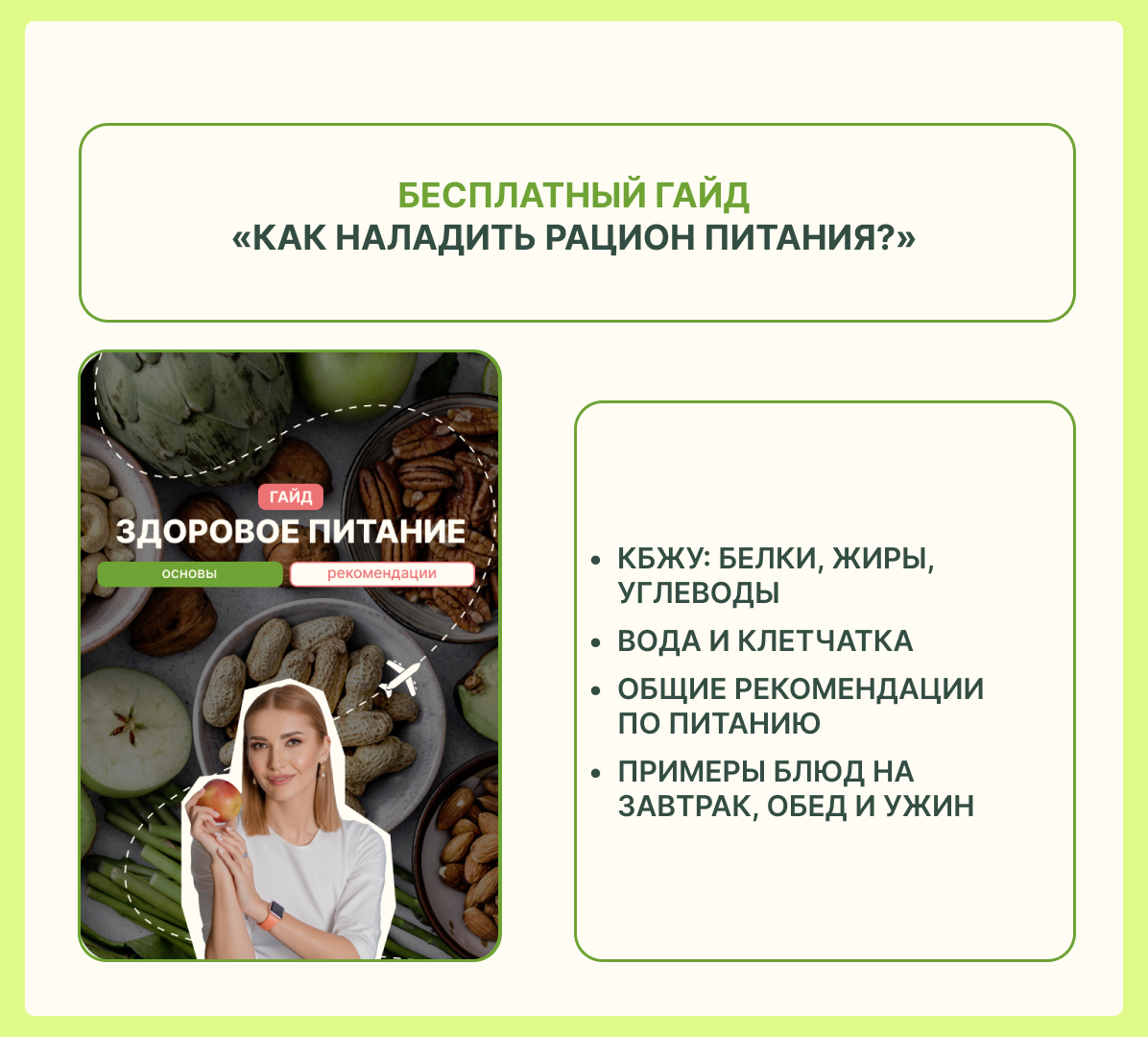 Из гайда вы узнаете, как сочетать в рационе белки, жиры, углеводы. А также в гайде вы найдёте пример меню на завтрак, обед и ужин.