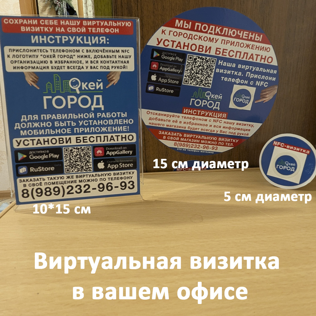 Вернуться в главное меню оглавления по ссылке, жми. Для заказа рекламы 8(989)232-96-93 (WhatsAPP, Telegram). Посмотрите видео пояснения по ссылке Виртуальная визитка — это новый маркетинговый инструмент для организаций вашего города. Повышает продажи вашего бизнеса! * Информация вашего магазина сохраняется на смартфоне клиента и 24/7 всегда у него под рукой! * Вы можете возвращать покупателей снова при помощи скидок и акций внутри виртуальной визитки! * Вся информация в визитке меняется по вашему запросу онлайн в любой момент не только на кассе, но и у всех клиентов, кто её сохранил ранее! * Одна виртуальная визитка в магазине заменяет все печатные в неограниченных количествах и навсегда. Вам не нужно больше печатать визитки! * Компактный размер размещения от 2.5 квадратных см гладкой поверхности. Функционал реализован на базе отечественного приложения "Окей Город" руками российских разработчиков! Стоимость установки единоразово 1000р. или бесплатно в рамках подключения в справочник "О