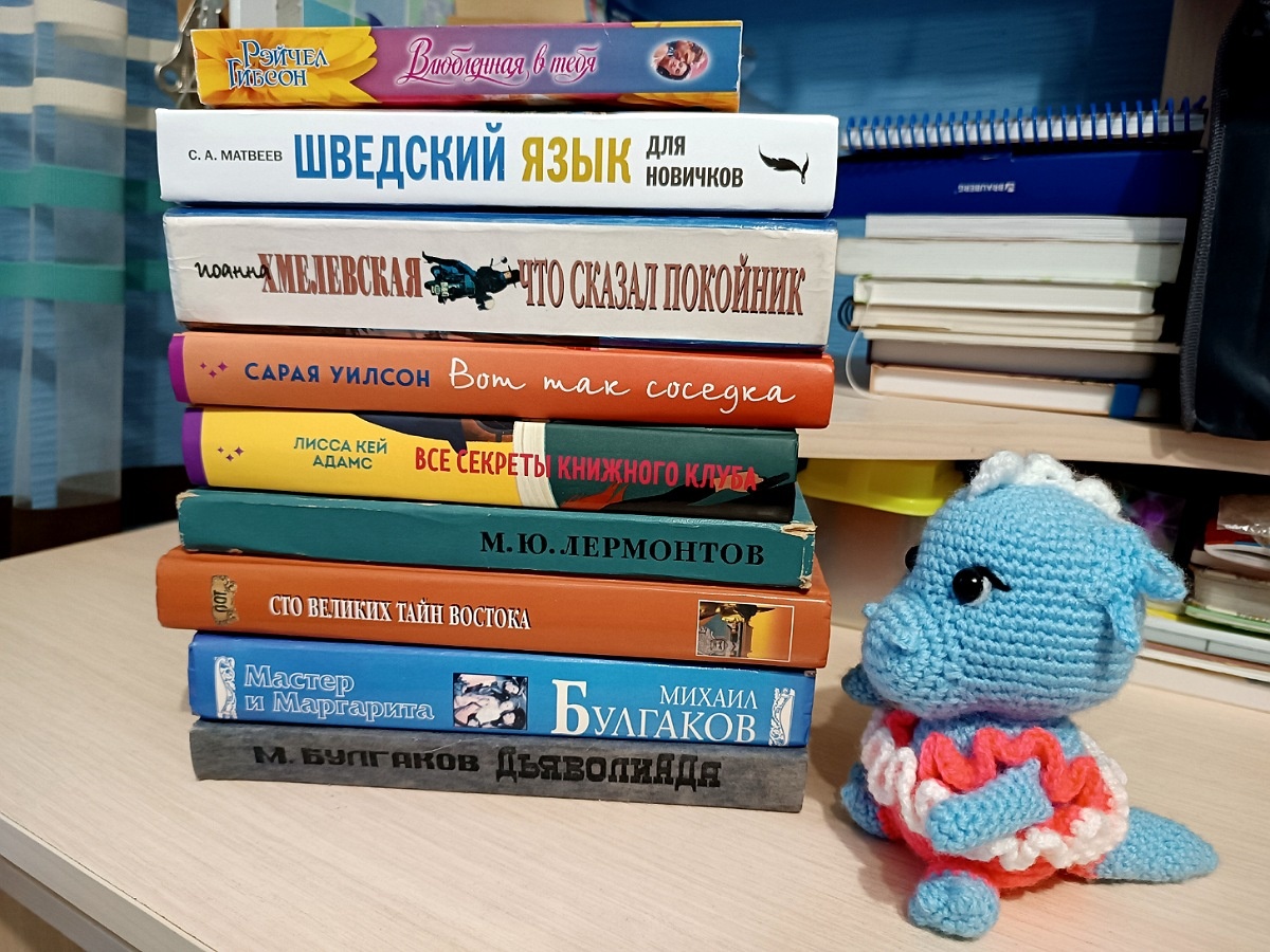 У меня есть не только стопки... да что там – полки непрочитанных книг, но с недавних пор на столе образовалась стопка книг «в процессе». Я не специально, оно само! :-)) Тут у меня книги, которые я не дочитала и отложила по разным причинам. А ещё те, что собираюсь прочесть в ближайшее время. Так сказать, поставила их первыми в очереди. Стопка получилась ничего так, моя Дракоша в шоке.