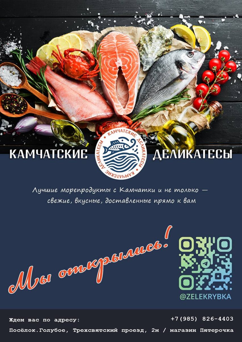 Теперь настоящие поклонники морепродуктов смогут оценить богатство Камчатского края прямо у себя поблизости. Магазин расположен удобно и готов предложить великолепный ассортимент продукции. В продаже: В магазине тщательно отбирают лучшие продукты, стремясь представить вам всё разнообразие и качество даров камчатского региона. Команда опытных специалистов готова помочь с выбором и рассказать о всех преимуществах каждого продукта. Заходите в «Камчатские деликатесы» и наслаждайтесь неповторимым вкусом и свежестью продукции. Не упустите возможность познакомиться с истинными деликатесами Камчатки. Адрес: п. Голубое, Трехсвятский проезд, 2 М, в здании магазина «Пятерочка». Время работы: каждый день с 10:00 до 22:00. Телеграм До скорой встречи в магазине «Камчатские деликатесы»!