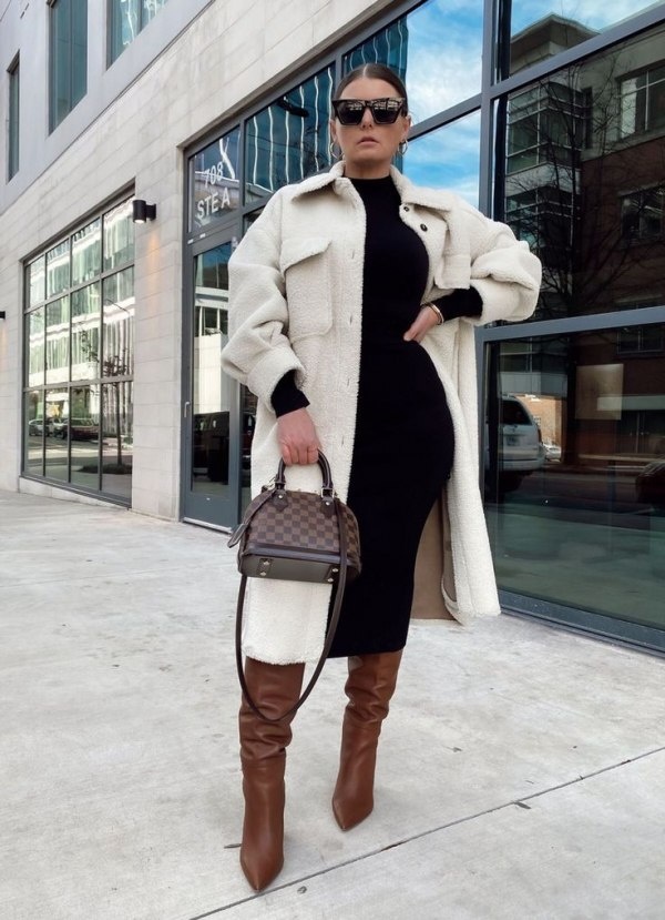 Контрастное сочетание цветов отлично работает для коррекции фигуры. Что имею в виду? Внутрь — черное платье или костюм. Они визуально подтянут силуэт. Сверху — молочная шуба, пальто или куртка. Они сыграют роль рамки и станут удачным верхним слоем.