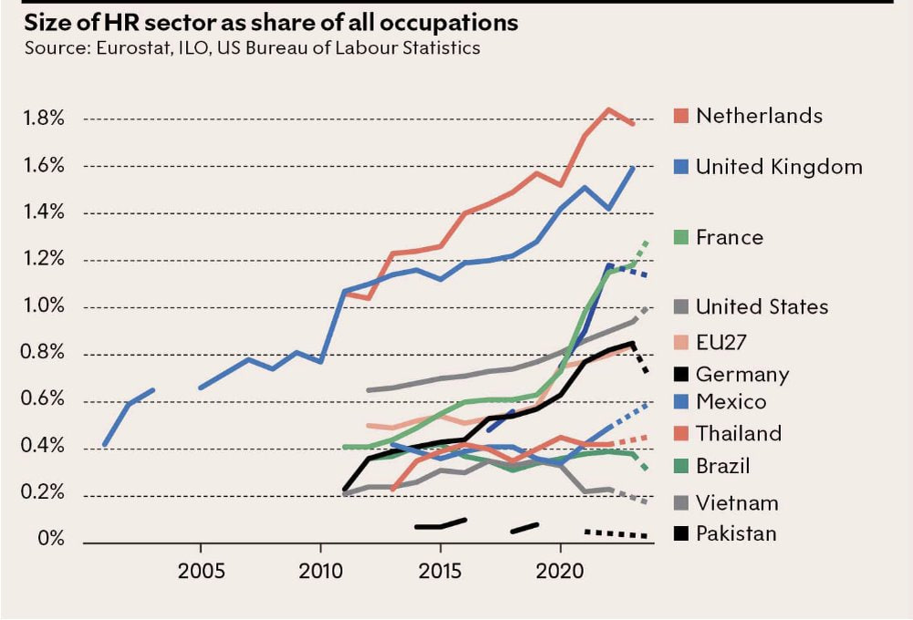 ПРИГЛАШАЮ ОТСЛЕЖИВАТЬ НАС В ТГ КАНАЛАХ HRtech&AI и HR-АНАЛИТИКА Данные взяты у Евростата, Американского бюро трудовой статистики и ILO (International Labour Organization – контора ООН). Нидерланды лидер с почти 1, 8 % - или это почти 1 HR на 50 работников. В среднем же доля HR растет и растет активно. В Великобритании с начала 2000-х рост в 2,5 раза – с 0, 6 до 1, 6 %. Не растет, а даже падает Бразилия, Вьетнам и Пакистан С одной стороны, это явный признак роста значимости человеческого ресурса, с другой – семимильными шагами шагает HRtech, а доля HR все равно растет – это говорит о том, что HRtech не успевает за потребностями организации? Или ни о чем не говорит? ну и да, России в списках нет. Мои исследования показывают, что у нас в среднем 1 HR на 100 работников, т.е. примерно 1 %, но в опросах участвуют обычно HR-ы крупных, официальных компаний, а большой пласт компаний остается вне опросов, поэтому в России, скорее всего, доля HR менее 1 % ПРИГЛАШАЮ ОТСЛЕЖИВАТЬ НАС В ТГ КАН