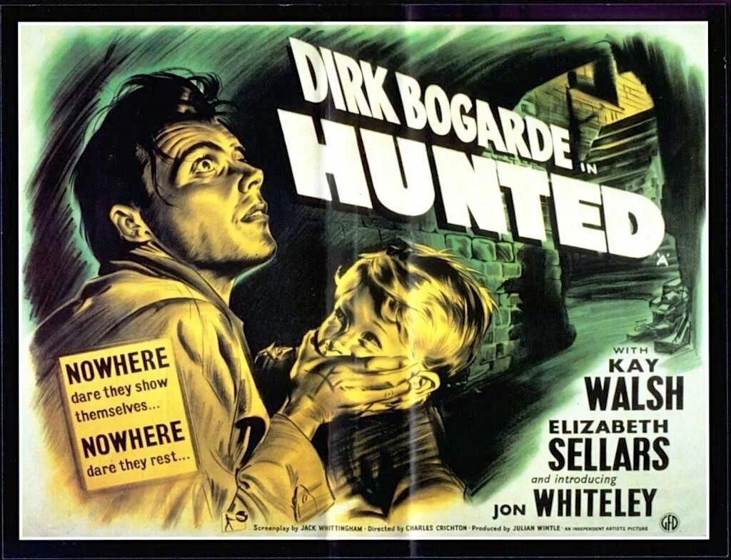 В каком-то издании, я когда-то прочитал: если вы прежде не любили Дирка Богарта, то после этого фильма, вы его непременно полюбите. Тогда я не придал этому значения, а спустя время, подпишусь под каждым словом. В этом фильме он относительно молод - тридцать с копейками, но выглядит ещё моложе. Но молодость не главное - главное талант, он у этого английского народного артиста есть. Итак фильм "Hunted"... Герой Богарта Крис, бывший моряк, в первых кадрах мы застаëм его возле трупа (самого убийства мы не видим). И тут он сталкивается с семилетним пацаненком Робби, который поджёг дома занавески и дал тягу, чтобы не попало от приёмных родителей. Крис мальчонку за шкибон - кажется, что он берёт его в заложники и в бега. Но то, что происходит дальше рушит всё устои, как нуаров, так и триллеров. У мальчишки вся спина исполосована ремнём мачехи и отчима, а у Криса, пафосно говоря, вся душа изранена - они становятся друзьями. Если бы не мальчик Робби, фильм превратился бы в банальную беготню