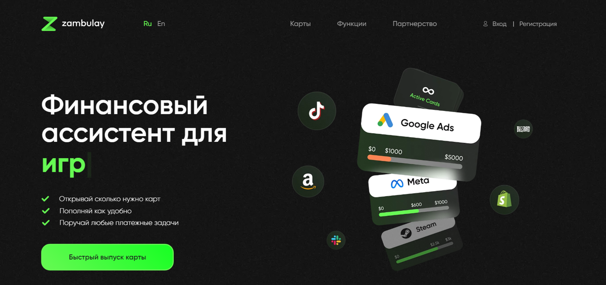Zambulay — это финансовый ассистент, предлагающий виртуальные карты для оплаты рекламы, сервисов и игр. Сервис позволяет выпускать неограниченное количество карт различных географических регионов, включая Европу, СНГ, США и Латинскую Америку. Пополнение баланса осуществляется удобными способами, а управление картами доступно через веб-интерфейс или Telegram-бот.