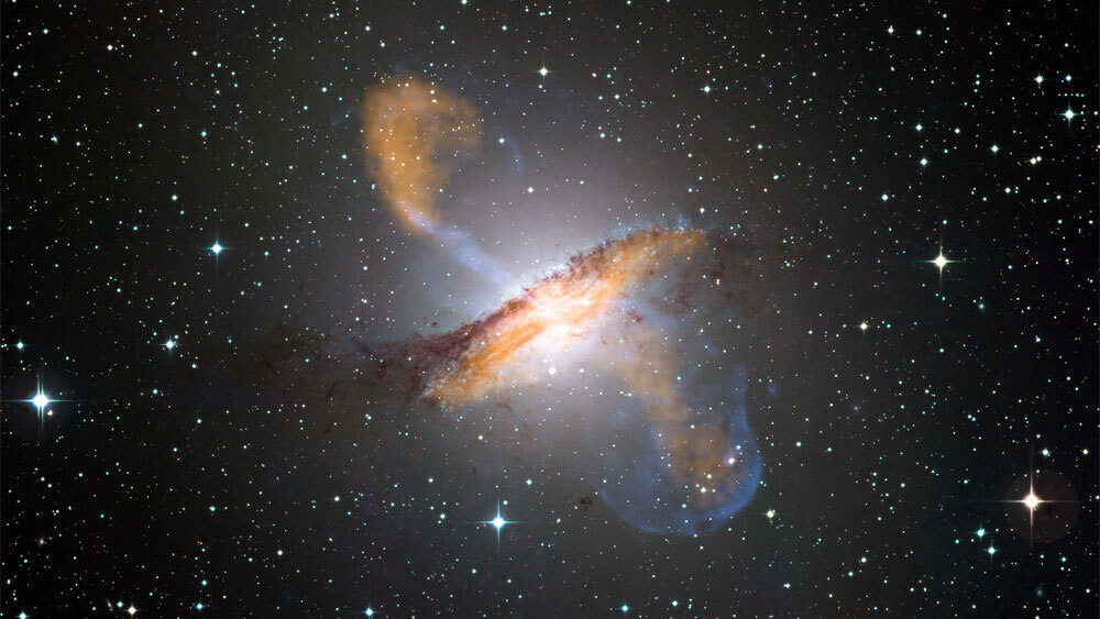 Масштабное столкновение в глубоком космосе зафиксировал рентгеновский телескоп NASA «Чандра». Мощная струя из черной дыры в центре галактики Центавр А примерно в 12 миллионах световых лет от Земли врезается в невидимый объект. Частицы высокой энергии вылетают не из самой Cen A, а из ее окрестностей, порожденные мощными магнитными и гравитационными полями, в виде струи. Она простирается на 30 тысяч световых лет и движется с околосветовой скоростью. В одном месте, словно споткнувшись, она делает V-образный изгиб. Этот участок, получивший обозначение C4, виден высокочувствительной «Чандрой» в рентгеновском диапазоне. Длина рукавов «V» достигает 700 световых лет (для сравнения, ближайшая к Земле звезда, кроме Солнца, находится примерно в четырех световых годах). Остается только догадываться, что служит препятствием для релятивистской струи. Скорее всего, это массивная звезда — одиночная или парная. Рассмотреть ее на таком расстоянии не представляется возможным. Гипотезы на этот счет выдвин