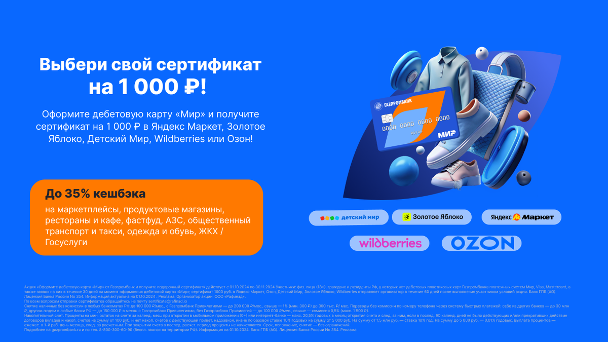 Банк возобновил акцию "Приятный кешбэк". Участие могут принять лица от 18 лет. не имеющие дебетовых карт в банке более 6 месяцев. Но кроме этого, новички могут поучаствовать еще в 2х акциях. 1️. Акция "Приятный кешбэк" - 1000б. Условия: ✅ Оформить дебетовую карту до 30.09.25 по ссылке ниже. ✅ Совершить покупку по карте на общую сумму от 1 000 ₽ в течение 30 дней после получения карты. ✅ 1000б придут на следующий месяц до 25 числа Условия 2️. Сертификат за дебетовую карту - на 1000р. на выбор (в Золотое Яблоко, Детский мир, Wildberries, Яндекс Маркет или Ozon) ✅ Оформить дебетовую карту до 31.01.25 по специальной ссылке ✅ Совершить покупку по карте на общую сумму от 1 000 ₽ в течение 30 дней после получения карты. ✅ Сертификат придёт в СМС на указанный номер телефона в течение 60 дней после покупки на сумму от 1 000 ₽ Акции сочетаются. Сочетаются. Заказывая карту и совершая траты на сумму от 1000р., участвуете в обеих акциях. 3️. Акция Газпромбанка: Кешбек 35% на важные покупки (