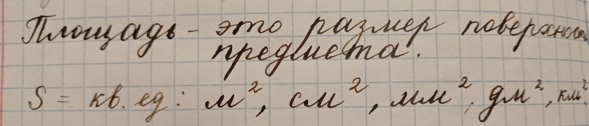 1. Проверка домашнего задания. Дети демонстрируют диаграммы, которые начертили дома. 2. Объявление темы урока. - Сравните размер доски окна; пола и потолка; противоположных стен; учебника и тетради; столешницы стола учителя и столешницу парты. Мы сейчас сравнивали площади предметов. Сегодня мы начинаем изучение площади. 3. Работа по теме урока. Откройте учебник на стр. 91 и прочитайте информацию о площади. - Как вы поняли, что такое площадь? (Это размер предмета). - Какие меры служат для измерения площадей? (Квадратные). По-английски квадрат "Square". Поэтому площадь в математике обозначают буквой s. -Какие квадратные меры перечислены? Квадратные единицы пишутся с маленькой цифрой 2 в правом верхнем углу. Запишем определение площади в тетради и начертим квадратные мм, см и дм. - Почему мы не сможем начертить в тетради квадратный метр? Прочитайте задание 528. Сколько квадратных сантиметров в этом прямоугольнике? Значит, площадь этого прямоугольника 7 кв.см. N 529. Сколько квадратных