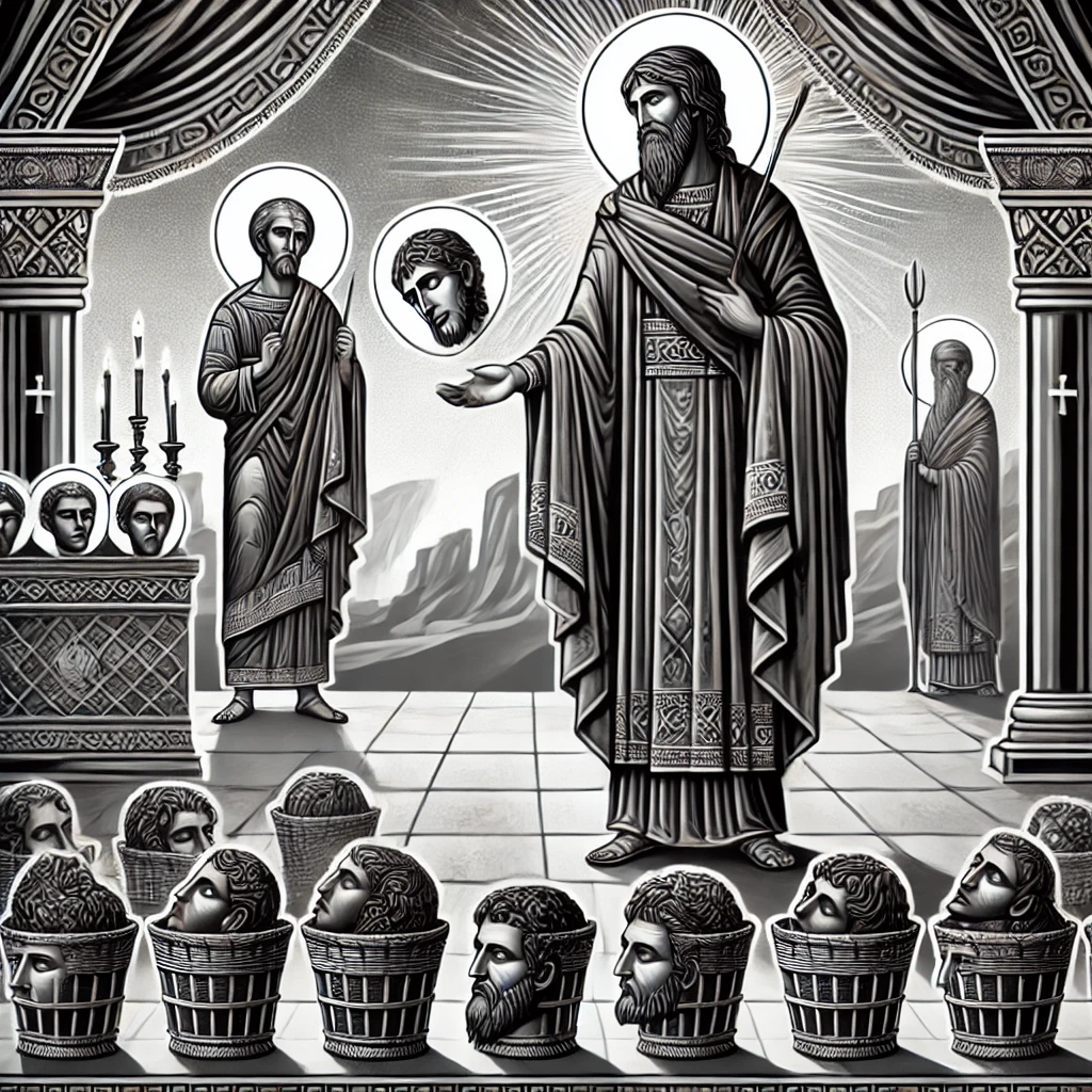 Тёмное небо укрыло Самарию. Тишина казалась предвестником беды. Город спал, но Иегу не мог себе этого позволить. Его взгляд был сосредоточен, а мысли — как острый меч, готовый к действию. В лагере горели костры, их свет отражался в глазах людей, готовых выполнить волю своего лидера. Эта ночь была кульминацией событий, которые тянулись уже годы. Королевская семья Иорама правила жестоко, сея страх и хаос. Город был раздираем на части интригами, идолопоклонством и несправедливостью. Но больше всего Иегу угнетала память о тех, кто пострадал от их рук. План Иегу был ясен. Он отправил письма старейшинам города с требованием казнить членов королевской семьи. — “Если вы верны своему народу и Господу, то выполните это задание. Отправьте головы Иорама за городские ворота как знак вашего подчинения.” Утро принесло весть. Семьдесят голов, аккуратно уложенных в корзины, были доставлены в условленное место. Иегу стоял перед ними, молча. Его сердце било тревогу, но он знал: это было необходимо. Он