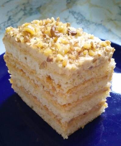 Это торт по мотивам довольно известного немецкого торта "Молочная девочка", но со вкусом крема-брюле, за счёт добавления в крем варёной сгущёнки.